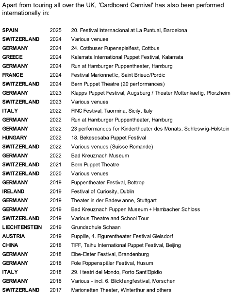 Puppetry movement and invention supported by a fantastic musical score, an exploration of the material of cardboard and a Lempen-